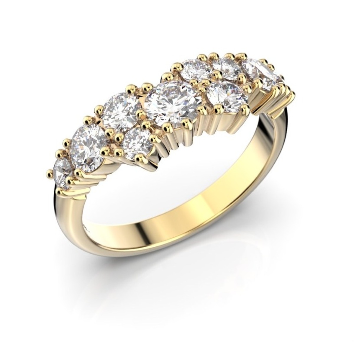 Festive Nadja Grand timanttisormus keltakulta 669-105-KK on näyttävä kokonaisuus, jonka keskiössä kimaltaa yhteensä kymmenen timanttia 0,25+2x0,18+2x0,11+5x0,05 (Yht. 1,05 ct). Sormuksessa on käytetty (valintasi mukaan 14K tai 18K) klassista keltakultaa, ja flakkamallin reunat on kevyesti pyöristetty, jolloin sormus istuu tukevasti ja pehmeästi sormessa. Sormuksen leveys on 2,6 mm. Nadja sivukivisormuksesta on saatavana myös ruusukulta- ja valkokultaversio. Yhdistämällä sormukset Juliette-rivisormukseen, luot täydellisen kokonaisuuden.