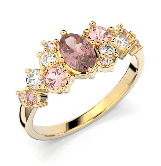 Sormuksen runkomateriaaliksi voit valita joko 14- tai 18 karaatin keltakullan, ja mallista on saatavana myös valko- ja ruusukultainen versio. Sormukseen on asemoitu 2 x 0,05 + 2 x 0,03 ct (yht. 0,16ct) timantit, 0,50 ct turmaliini ja 2 x 0,10 + 2 x 0,03 + 4 x 0,01 ct pinkit safiirit.
