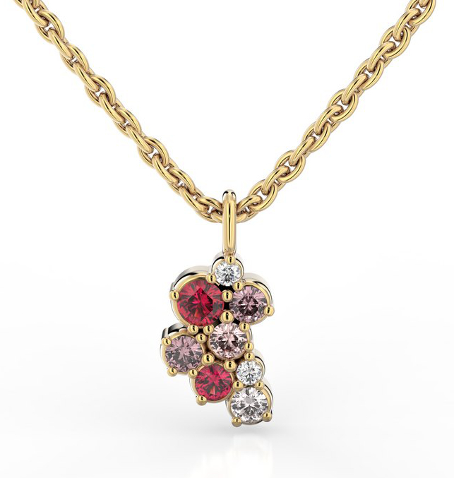 Festive Nelly Pink 630-022P-KK kaunista roosansävyistä timanttivärikiviriipusta koristaa timantit (2 x 0,01 ), turmaliinit (2 x 0,03 ct), vaaleanpunaiset safiirit (2 x 0,03 ct) ja rubiinit (0,05 + 0,03 ct). Kivet on ryhmitelty kauniisti hieman epätasaiseen riviin 13 mm pitkään runkoon tavalla, joka saa kivet säkenöimään toisiaan vasten ja luovat hyvin ainutlaatuisen kokonaisuuden. Yhdistä Nelly-korvakorujen kanssa ja luo ainutlaatuinen kokonaisuus. Ketju myydään erikseen.