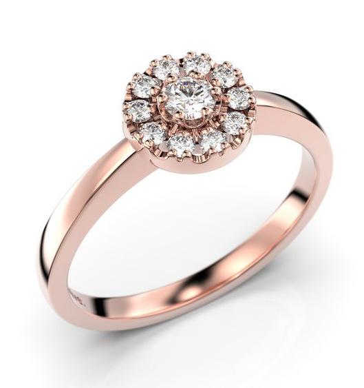 Festive Olivia 563-017-PK -halo-timanttisormuksessa yhdistyy moderni flakkarunko herkkään kukkamaiseen haloistutukseen. Sormuksen timantti-istutukseen kuuluu suurempi 0,07 karaatin keskikivi, jota ympäröi kymmenen muuta 0,01 karaatin Wesselton-timanttia. Jalokivet on hiottu perinteisellä briljantti-hionnalla, joka korostaa timanttien kirkkautta ja loistoa.