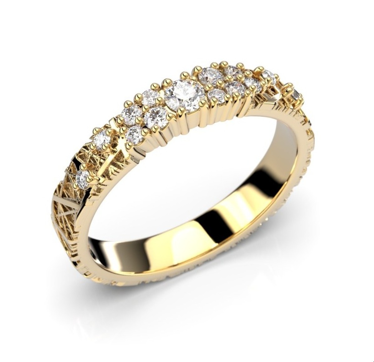 Festive Routa Rakka Kaita 3,5 mm timanttisormus 664-015-KK on keltakultaa, ja sormuksen pintaa koristaa graniitin pintakuvioinnista inspiraationsa saanut kuvio sekä briljanttihiotut timantit 0,07+2x0,02+2x0,015+9x0,01 (yht. 0,23 ct).