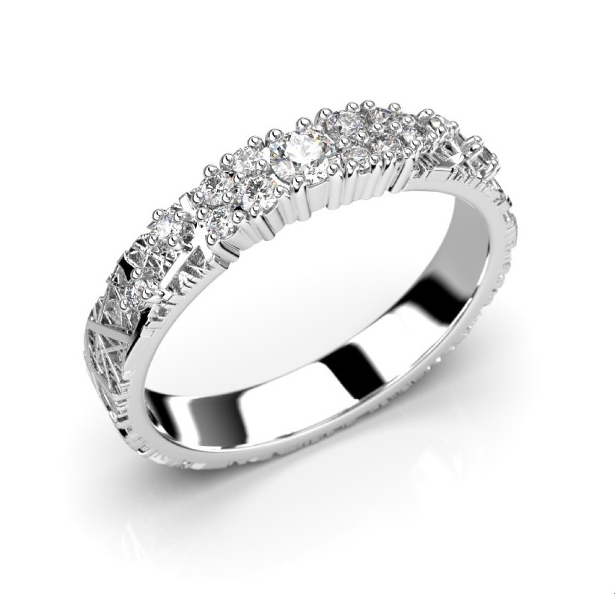 Festive Routa Rakka Kaita 3,5 mm timanttisormus 665-023-VK on valkokultaa, ja sormuksen pintaa koristaa graniitin pintakuvioinnista inspiraationsa saanut kuvio sekä briljanttihiotut timantit 0,07+2x0,02+2x0,015+9x0,01 (yht. 0,23 ct).