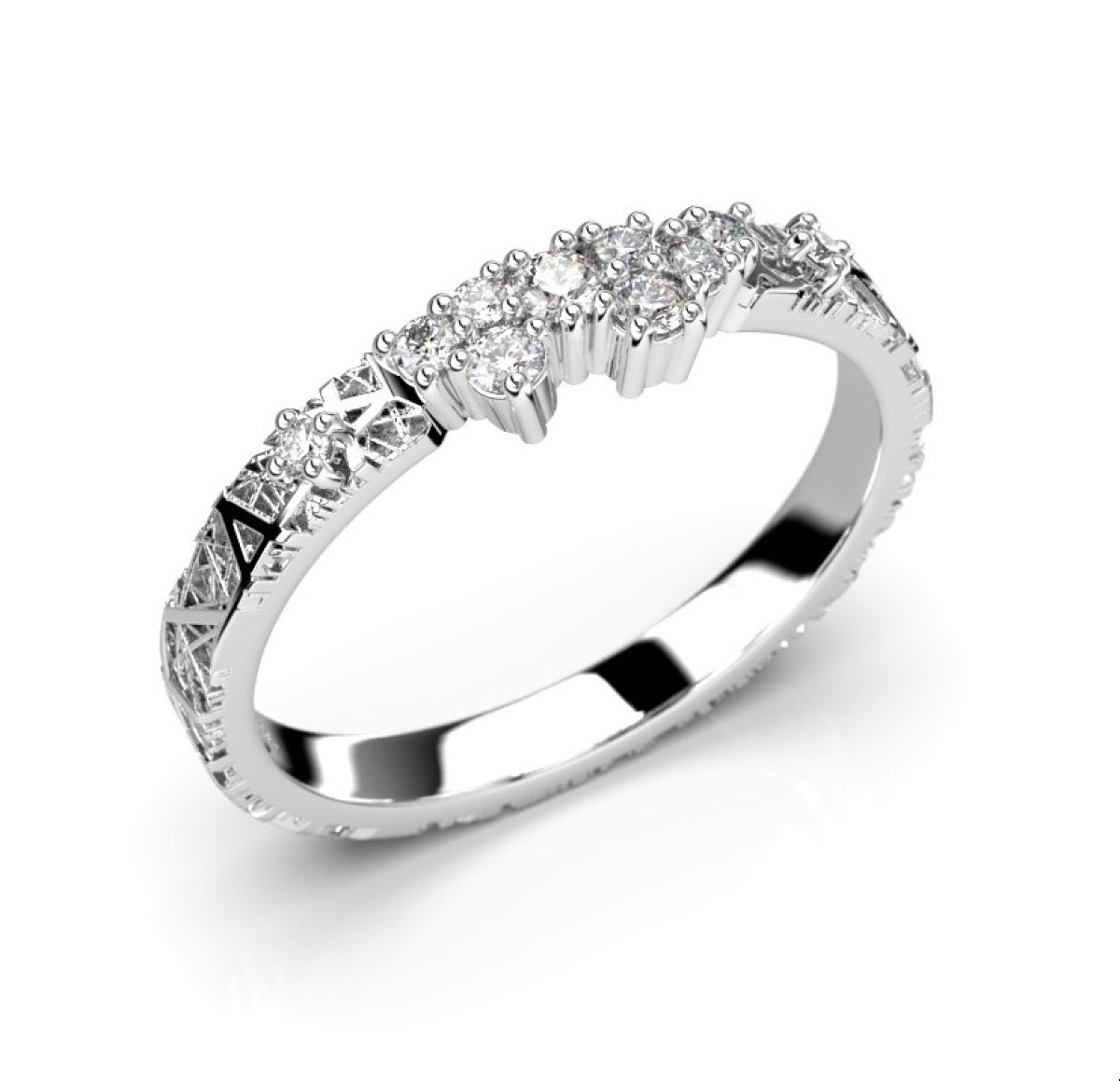 Festive Routa Rakka Sivu 2,5 mm timanttisormus 666-015-VK on valkokultaa, ja sormuksen pintaa koristaa graniitin pintakuvioinnista inspiraationsa saanut kuvio sekä briljanttihiotut timantit 0,07+2x0,02+2x0,015+9x0,01 (yht. 0,23 ct).