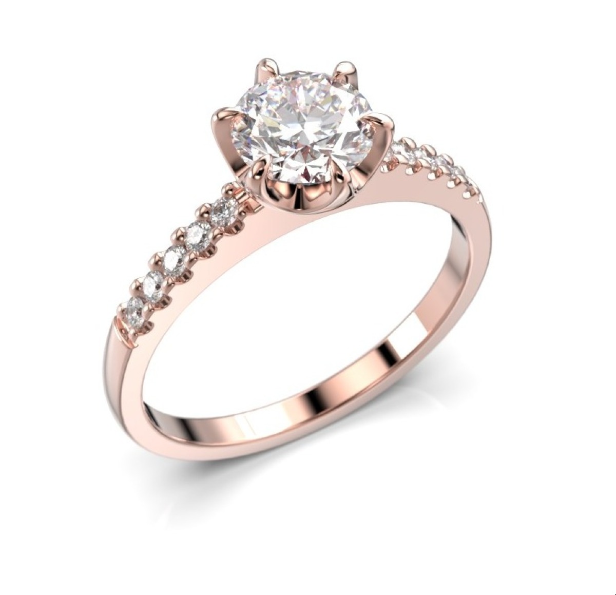 Festive Timanttisormus Julianna sivukivi 0,80 ct ruusukulta 682-080-PK on ajaton ja elegantti sivukivisormus, jota koristaa 10 0,01 karaatin timanttia ja yksi suurempi 0,70 karaatin timantti. Rungon materiaalina on käytetty (valintasi mukaan 14K tai 18K) ruusukultaa, ja flakkamallin reunat on kevyesti pyöristetty, jolloin sormus istuu tukevasti ja pehmeästi sormessa. Sormuksen leveys on 1,9 mm. Istutuksen kohdalta sormuksen koko on 6,5 mm. Julianna-sormuksesta on saatavana myös kelta- ja valkokultaversio.