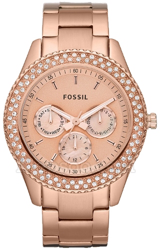 Fossil naisten rannekello ES3003. Kellon rungon leveys on 38mm ja paksuus 11mm. Rannekkeen leveys on 18mm. Kellossa päivyri, viikonivänäyttö sekä 24h näyttö. Fossil kelloille myönnetään kahden vuoden takuu. Kello toimitetaan valmistajan alkuperäisessä rasiassa.