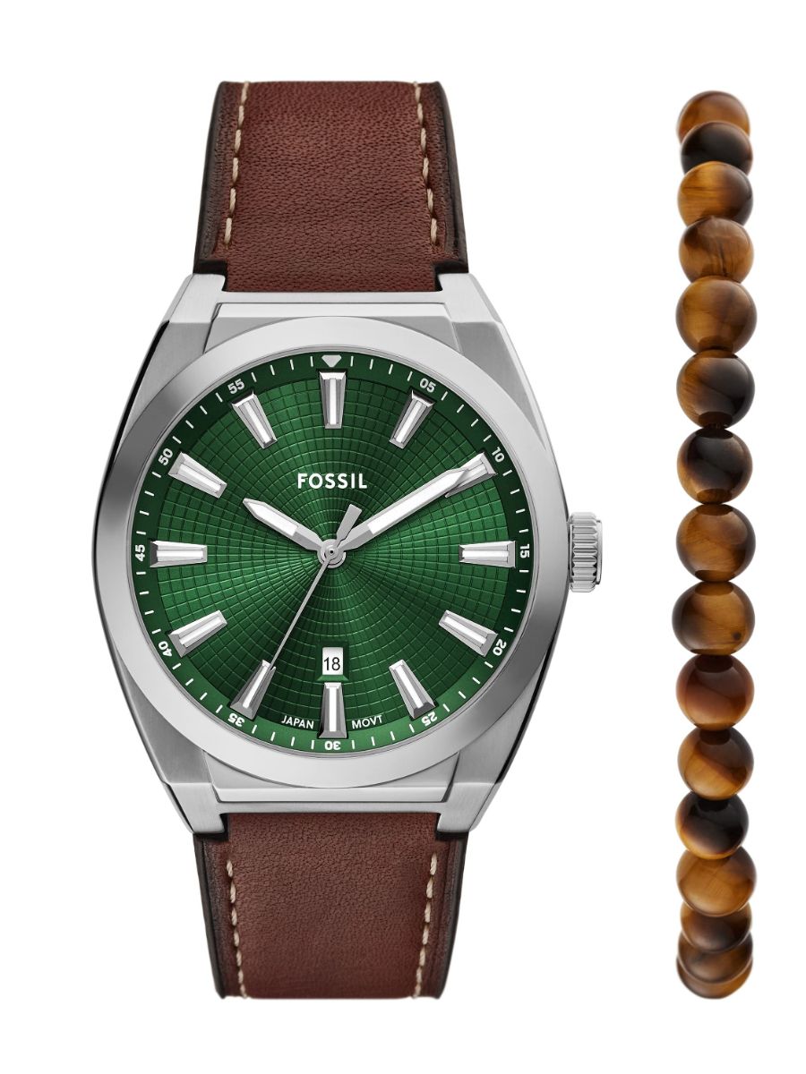 Fossil Everett 3 hand Date Silver Brown leather FS6080SET lahjapakkaus on klassinen lahja miehelle, ja se sisältää Everett-kellon sekä yhteensopivan helmirannekorun.