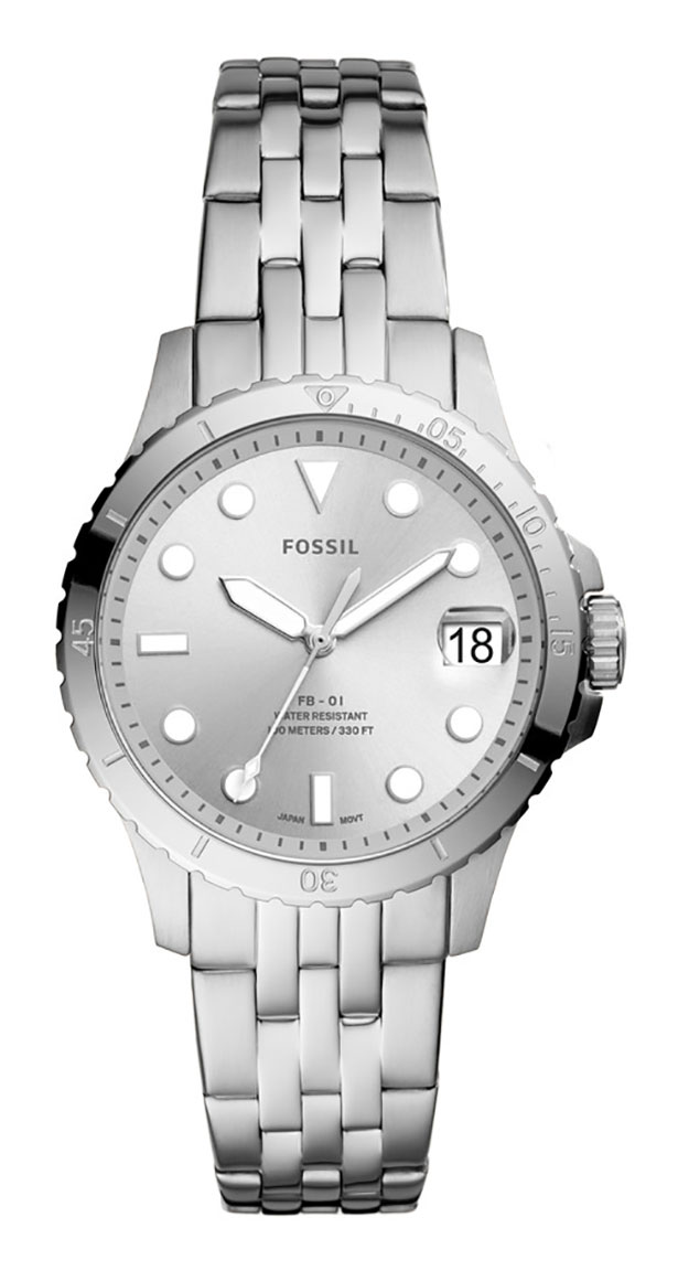 Naisten Fossil FB-01 ES4744 -rannekello on saanut inspiraationsa sukeltajankellosta, ja siinä on 36 mm leveä runko ja hopeanvärinen kellotaulu, ja 18 mm leveä turvalukollinen teräsranneke. Suuret osoittimet ja indeksit on luminoitu, ja ne näkyvät myös pimeässä, ja kello kolmen kohdalla on päivyri. Kello on vedenkestävä 100 m saakka, jonka vuoksi kellon kastumisesta ei tarvitse huolehtia. Fossil-kellot toimitetaan valmistajan alkuperäisessä pakkauksessa, ja niillä on 2 vuoden takuu.