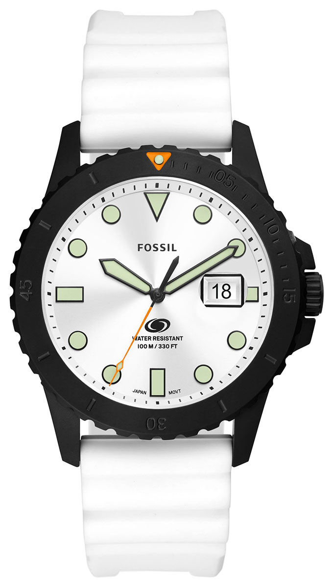 Fossil Blue FS5999 sukeltajankellossa on klassinen ilme, joka on täydellinen vapaa-ajan pukeutumiseen, valkoinen sunray-kellotaulu 42 mm leveässä, mustassa rungossa, 100 metrin vedenpitävyys ja pyörivä 24 tunnin bezel. Suuret indeksit ovat helppolukuiset ja kyklooppilinssillä viimeistelty päivyri löytyy kello kolmesta. 100 metrin vedenkesto viimeistelee kokonaisuuden, ja kello soveltuu uimiseen ja vesiurheiluun. Fossil-kellot toimitetaan valmistajan alkuperäisessä pakkauksessa ja niillä on kahden vuoden takuu