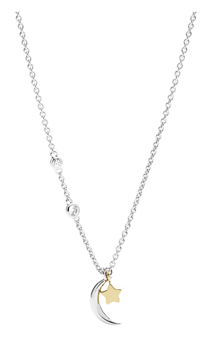 Fossil Sterling Silver Star and Crescent Moon Necklace JFS00432998 -kaulakoru on valmistettu sterling-hopeasta. Kaulakorun pituus on 42 - 47,5 cm. Kaulakorussa on kaksi säihkyvää korukiveä ja 12 mm pitkä kuunsirpin muotoinen riipus. Fossil-korut toimitetaan valmistajan alkuperäisessä rasiassa.