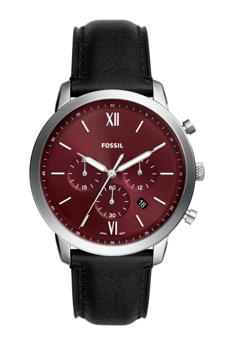 Fossil Neutra Chronograph Black leather FS6016 on klassinen miesten puvunkello, ja täydellinen valinta juhlakelloksi. Kellossa on tyylikäs ja ajaton muotokieli, 42 mm leveä runko sekä roomalaiset indeksit. Kellon viininpunaisessa taulussa kolme alaruutua ajanotolle, mikä mahdollistaa kellon monipuolisen käytön vapaa-ajalla, ja kokonaisuus on viimeistelty nahkarannekkeella. Amerikkalaisen Fossil-tuotemerkin suunnittelemilla rannekelloilla on 2 vuoden takuu, ja ne lähetetään kotiin valmistajan alkuperäispakkauksessa.