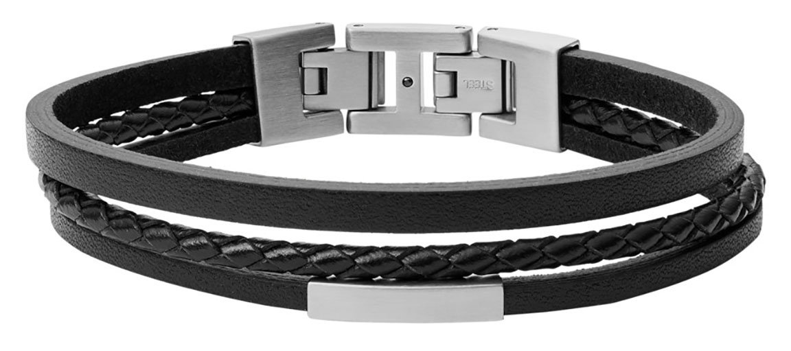 Fossil Multi-Strand Silver-Tone Steel and Black Leather Bracelet JF03322040 -rannekoru on valmistettu mustasta nahasta ja ruostumattomasta teräksestä. Korun pituus on 195 - 210 mm. Kiinnitys kätevällä magneettilukolla. Fossil-korut toimitetaan valmistajan alkuperäisessä rasiassa.