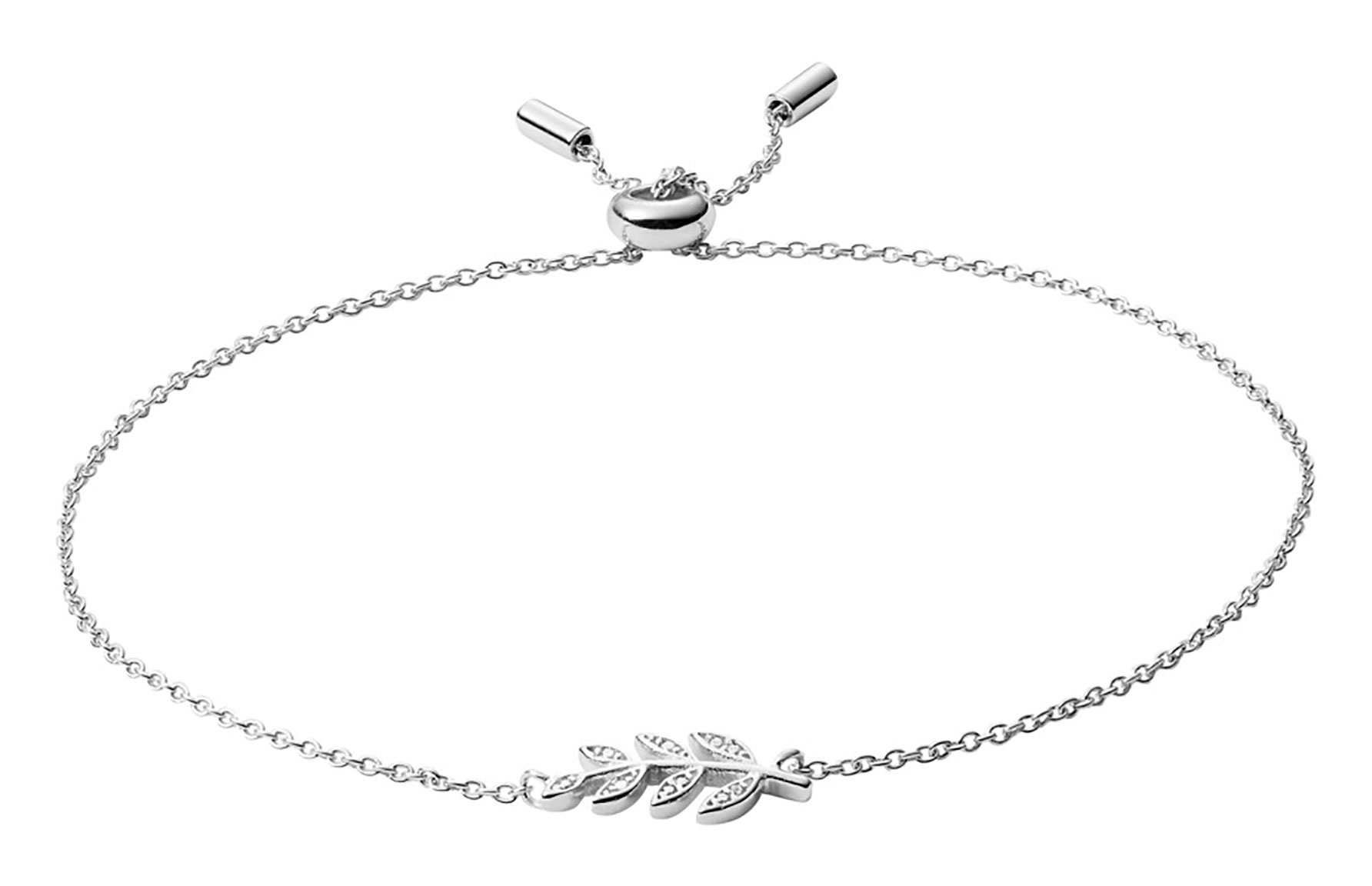 Fossil Olive Branch Sterling Silver Bracelet JFS00484040 -rannekoru on valmistettu sterling-hopeasta. Korun pituus on max 215 mm, mutta se on myös säädettävissä pienemmäksi. Korukivin koristellun riipuksen leveys on 15 mm. Fossil-korut toimitetaan valmistajan alkuperäisessä rasiassa.