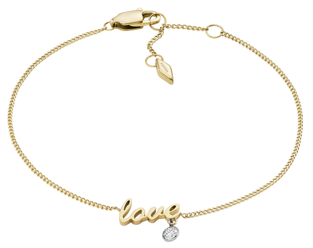 Rakkautta ilmassa. Fossil Sadie rannekoru JF04362998 on varustettu suloisella tekstillä "love" ja pienellä zirkonialla. Koru on kullattua terästä. Riipuksen koko on 6,5 x 12,5 mm, ketjun pituus 16,5-19 cm. Fossil-korut toimitetaan valmistajan alkuperäisessä rasiassa.