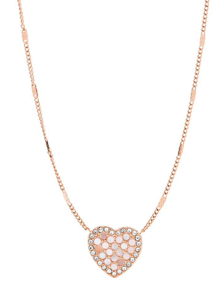 Fossil VINTAGE GLITZ JF03164791-kaulakorussa on 45,7 cm pitkä ketju, jota koristaa suuri sydänriipus. Korun pintaan on istutettu pave-tekniikalla useita korukiviä. Ketju on säädettävissä 40.6 -45,7 cm pituuteen. Fossil-korut toimitetaan valmistajan alkuperäisessä rasiassa.