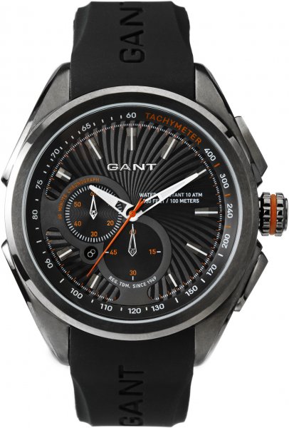 Miesten mustanpuhuva Gant W105812 Milford rannekello päivyrillä ja ajanottotoiminnolla. Gant Milford W105812 kellossa on musta kumiranneke, kellotaulu ja runko. Koneistona kellossa on laadukas Miyotan 0S20 patterikoneisto. Kellon rungon leveys 45mm ja paksuus 14mm. Kumirannekkeen leveys on 20mm. Gant kelloille myönnetään 2 vuoden takuu ja ne toimitetaan valmistajan alkuperäisessä rasiassa postikuluitta!