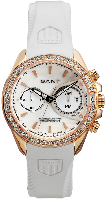 Naisten Gant W10652 bedstone rannekello kirkkailla Zirconia istutuksilla. Kellossa on myös päivyri ja ajanotto-ominaisuus. Gant Bedstone W10652 mallissa on punakullan värinen runko ja valkoinen kumiranneke. Kellon punakullan väriseksi pinnoitetun teräsrungon leveys on 39mm ja paksuus 13mm. Valkoisen kumirannekkeen leveys on 16mm. Gant kelloille myönnetään 2 vuoden takuu ja ne toimitetaan valmistajan alkuperäisessä rasiassa postikuluitta!