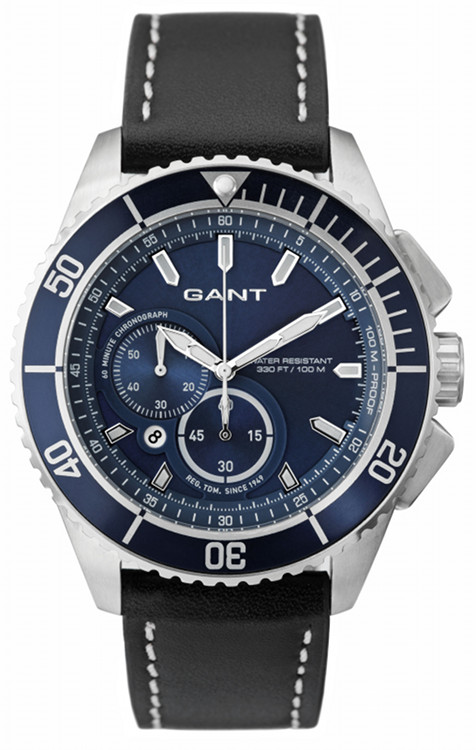 Miesten Gant W70546 Seabrook Chrono. Hieno sukellustyylinen kello nahkarannekkeella. Kellon rungon leveys on 45mm ja paksuus 13mm. Mustan nahkarannekkeen leveys on 22mm. Kellossa ajanotto sekä päivyri. Gant kelloille myönnetään 2 vuoden takuu ja ne toimitetaan valmistajan alkuperäisessä rasiassa postikuluitta!