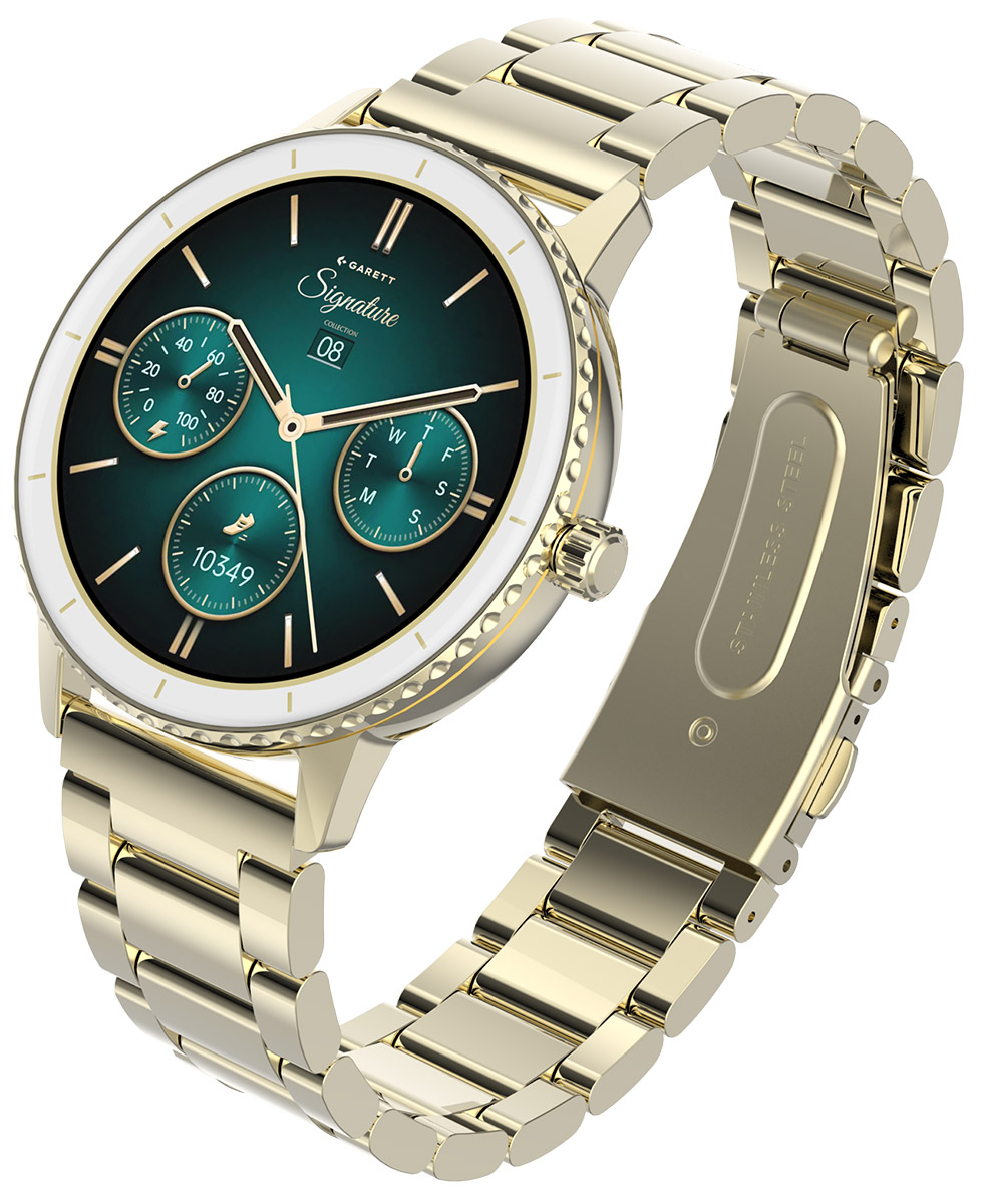 Garett Signature Grace Gold Solid on tyylikäs ja moderni älykello, joka yhdistää saumattomasti muodin, teknologian ja hyvinvoinnin. Kullan sävyinen viimeistely ja siro, vain 9,2 mm ohut rakenne luovat elegantin kokonaisuuden, joka istuu kauniisti ranteeseen ja täydentää niin arki- kuin juhlatyylin. Kellon mukana toimitetaan sekä teräsranneke että valkoinen ekologinen nahkaranneke, joiden avulla voit muokata ilmettäsi tilanteen mukaan.