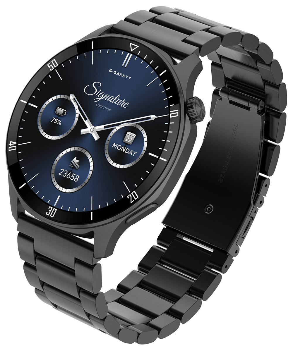 Garett Signature Prime Black Solid on moderni ja huoliteltu älykello, jossa klassinen kellomuotoilu yhdistyy nykyaikaiseen teknologiaan. Musta teräsrunko ja selkeälinjainen muotoilu luovat ajattoman ilmeen, joka sopii niin arkeen kuin viimeisteltyyn pukeutumiseen. Siro, vain 8,9 mm ohut rakenne tekee kellosta kevyen ja miellyttävän käyttää koko päivän ajan.