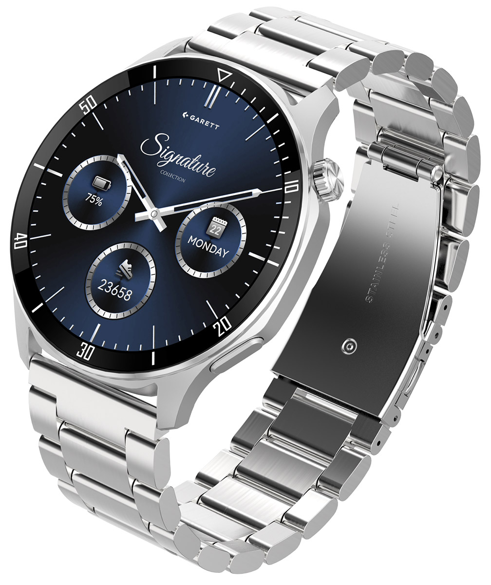 Garett Signature Prime Silver Solid on moderni ja huoliteltu älykello, jossa klassinen kellomuotoilu yhdistyy nykyaikaiseen teknologiaan. Hopeanvärinen teräsrunko ja selkeälinjainen muotoilu luovat ajattoman ilmeen, joka sopii niin arkeen kuin viimeisteltyyn pukeutumiseen. Siro, vain 8,9 mm ohut rakenne tekee kellosta kevyen ja miellyttävän käyttää koko päivän ajan.