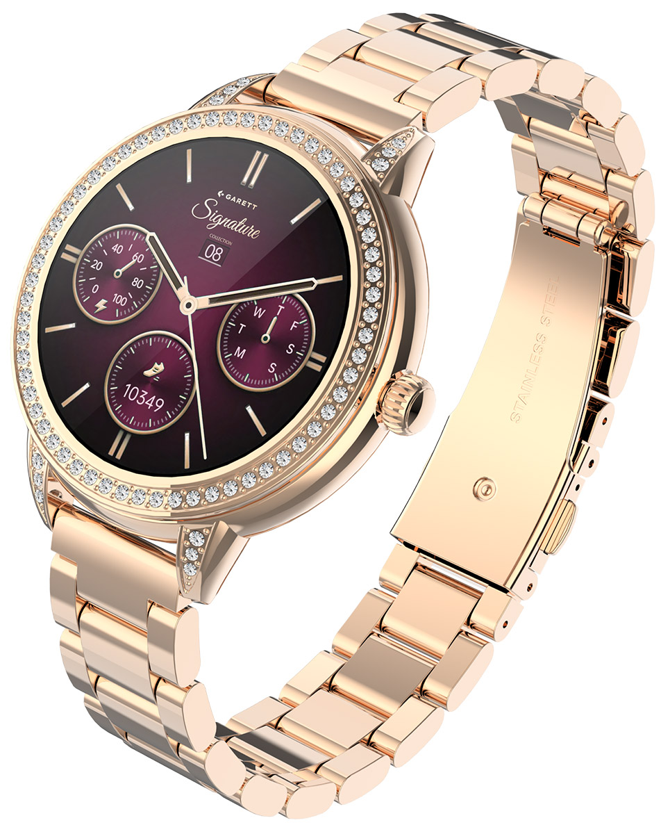 Garett Signature Stella Rose Gold Solid on elegantti älykello, jossa korumainen muotoilu ja moderni teknologia kohtaavat täydellisessä tasapainossa. Ruusukullan sävyinen viimeistely ja kehyksen hienovaraisesti kimaltelevat koristekivet tuovat ranteeseen ylellistä säihkettä, tehden kellosta näyttävän mutta silti ajattoman lisän tyyliisi. Siro, vain 10,5 mm ohut rakenne istuu kevyesti ranteessa ja korostaa kellon hienostunutta ilmettä.