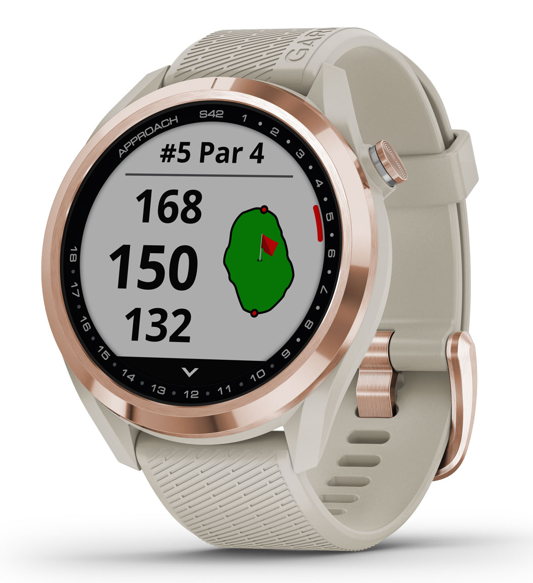Uusi Garmin Approach S42 Rose Gold with Light Sand Band 010-02572-02 -GPS-golfälykello on golfaajan paras ystävä. Se ei ainoastaan paranna golf-tuloksiasi, vaan tyylikkään ulkoasunsa ansiosta se toimii myös jokapäiväisenä asusteena. Kello on varustettu helppolukuisella 1,2” värillisellä kosketusnäytöllä. Kellon hiekanvärinen 43,4 mm leveä ja 11,7 mm paksu runko on valmistettu muovista. Kellon kehys on ruusukulalnväristä metallia. Rannekkeena kellossa on helposti vaihdettava hiekanvärinen silikoniranneke, jonka leveys kiinnityskohdasta on 20 mm.