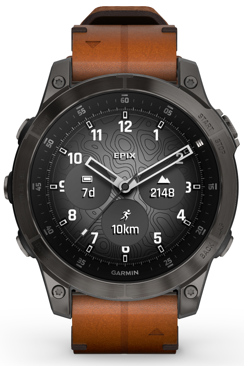 Garmin Epix Gen 2 Sapphire musta/hiilenharmaa DLC-pinnoitettu titaani ja kastanjanruskea nahkaranneke + silikoniranneke AMOLED-älykello 010-02582-30 on Garminin huippu-uutuus. Kellossa on safiirilasin alla suojassa häikäisevä aina päällä oleva 1,3” AMOLED-näyttö. Kellon 47 mm leveä runko on valmistettu kuitulujitepolymeeristä ja sen takakansi on titaania. Kellon kosketusnäyttöliittymä ja perinteiset painikkeet tekevät valikoiden käytöstä helppoa. Rannesykemittari pitää sisällään huippuluokan harjoitusominaisuudet, urheilusovellukset sekä jatkuvan hyvinvoinnin ja terveyden seurannan. Yli 30 esiladattua urheilusovellusta mahdollistavat juuri sellaisen treenin kuin itse haluat. Kattavat suoritustoiminnot ja Garmin Coach -harjoitusohjelmat auttavat viemään treenaamisesi uudelle tasolle. Ominaisuuksiin kuuluu lisäksi muun muassa älykkäät ilmoitukset, Garmin Pay -lähimaksu sekä musiikin tallennus.