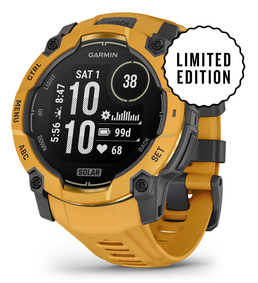 Garmin Instinct 3 50mm Solar Sunburst Limited Edition 010-02935-02 on rajoitettuun erään kuuluva 50 mm:n GPS-älykello, jossa on 1,1" näyttö, sisäinen LED-taskulamppu ja jonka akunkesto on rajaton älykellotilassa aurinkolatauksella (oletuksena käyttö vuorokauden ympäri, mistä 3 h/päivä ulkona 50 000 luksin olosuhteissa). Sen ruuvikiinnitteinen rakenne, metallivahvisteinen kehys ja safiirilasi kestävät kovimmissakin olosuhteissa. Upean ulkomuodon viimeistelee kestävä 26 mm leveä silikoniranneke, joka on yhteensopiva ranteille, joiden ympärysmitta on 141 – 213 mm. Garmin Instinct 3 on lisäksi testattu lämmön- ja iskunkestävyyden kannalta MIL-STD-810-standardien mukaisesti, ja sen vesitiiviysluokitus on 10 ATM.