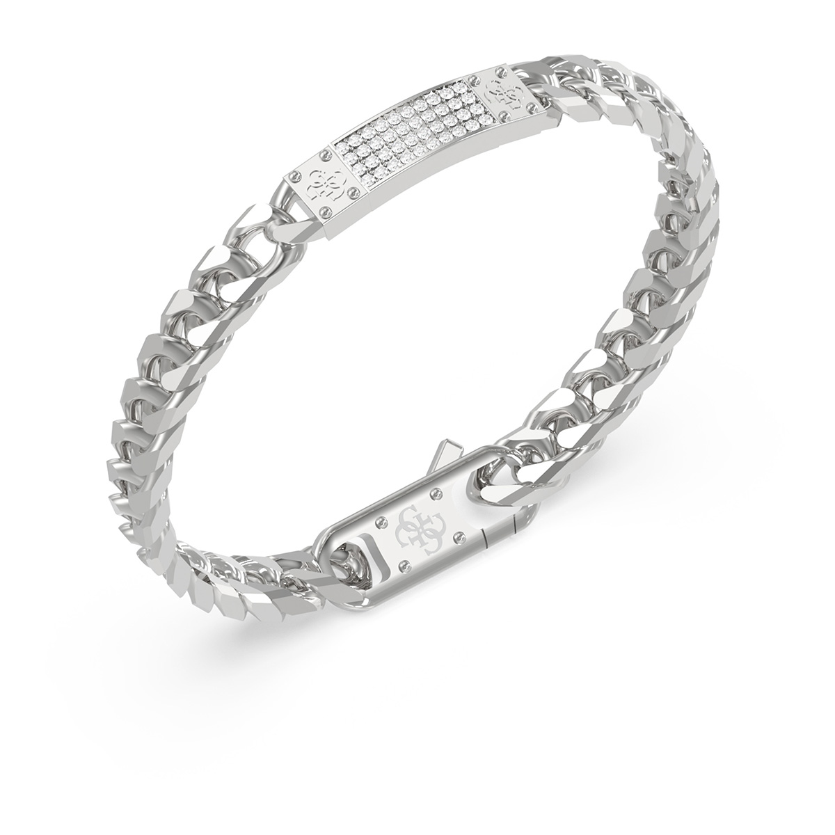 GUESS 4G Frontiers JUMB06031JWSTL on näyttävä miesten rannekoru, jossa yhdistyvät GUESS-brändin ikoninen ilme ja ajaton eleganssi. Kiiltävästä ruostumattomasta teräksestä valmistettu rannekoru on tyylikäs asuste, joka viimeistelee niin arki- kuin juhla-asun. Rannekorussa on komea laatta, johon on istutettu kirkkaita kristalleja tuomaan korulle lisähohtoa. Huoliteltu ketjurakenne ja laadukas viimeistely tekevät korusta kestävän ja mukavan käyttää päivästä toiseen. Rannekorun pituus 21 cm. Ketjun leveys 6,5 mm ja laatan pituus 23,6 mm.