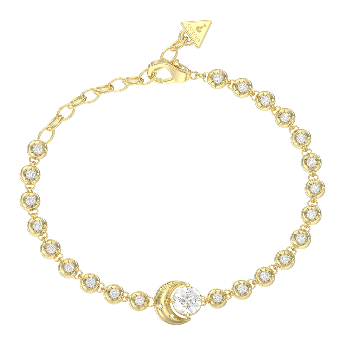 GUESS Aurora JUBB06235JWYGS on monilla kirkkailla zirkonioilla koristeltu rannekoru, joka yhdistää elegantin muotoilun ja trendikkään suunnittelun, mikä tekee siitä täydellisen asusteen niin arkeen kuin juhlaan. Korun pääosassa on yksityiskohtainen kuunsirppi-hela, joka syleilee isoa zirkonia korukiveä. GUESS Aurora-rannekoru on valmistettu kullatusta ruostumattomasta teräksestä, joka tuo ranteeseesi ripauksen glamouria missä kuljetkin. Ketjussa on helppokäyttöinen papukaijalukko. Kuu-koristeen koko 10 mm. Ketjun pituus 14,6 - 18,4 cm.