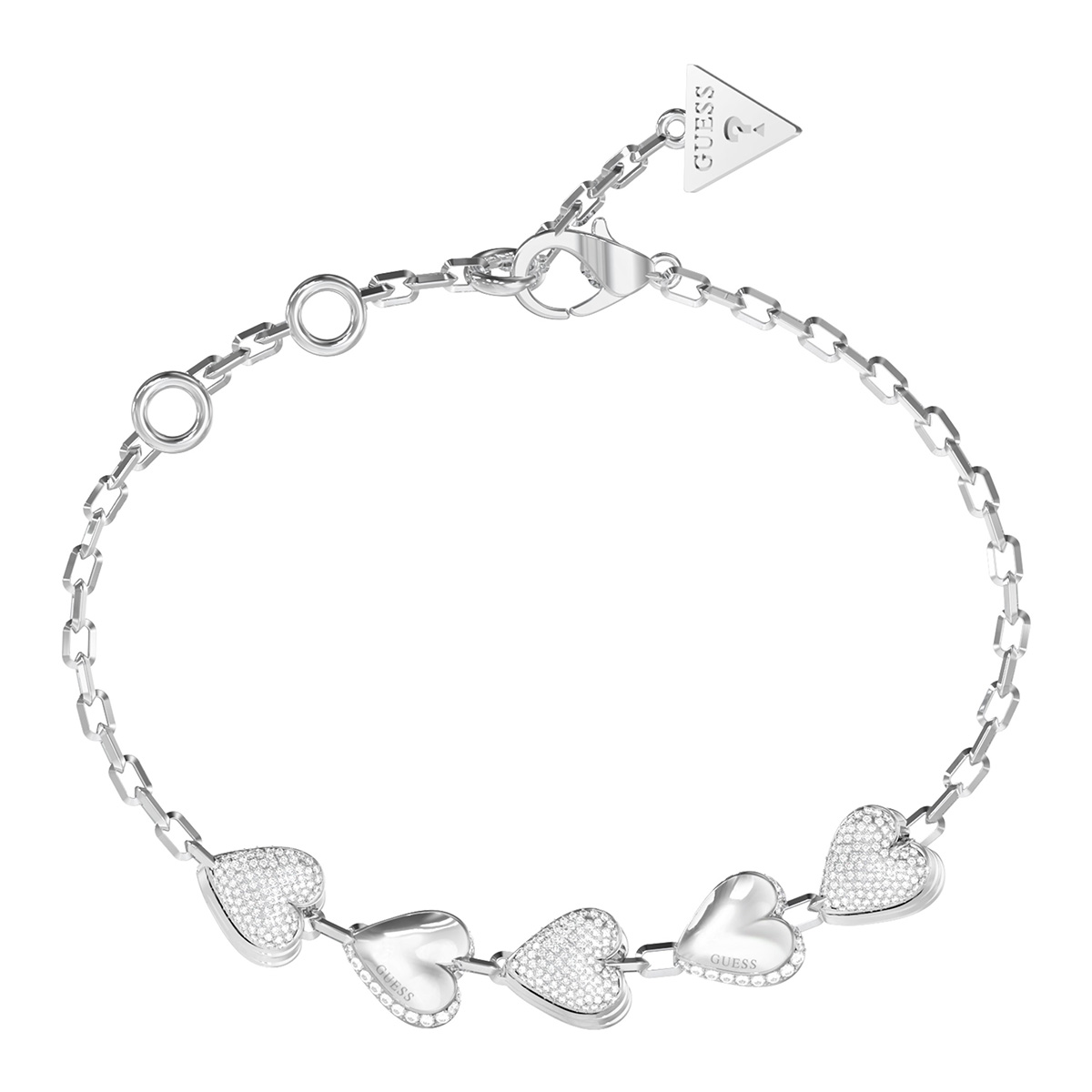 GUESS By Your Side JUBB06071JWRHS on näyttävä rannekoru, jota koristaa viisi hopeanväristä sydänhelaa, joihin on pave-istutettu säihkyviä kristalleja. Rannekoru on valmistettu ruostumattomasta teräksestä ja sen lukkona toimii helposti avattava/suljettava papukaijalukko. By Your Side -rannekoru on suunniteltu viimeistelemään ulkonäkö naisellisella ja elegantilla ilmeellä. Rannekorun ajaton muotoilu mahdollistaa myös helpon yhdisteltävyyden muiden korujen tai asusteiden kanssa. Sydänhelojen pituus 47 mm. Ketjun pituus 14,6 cm - 18,4cm.