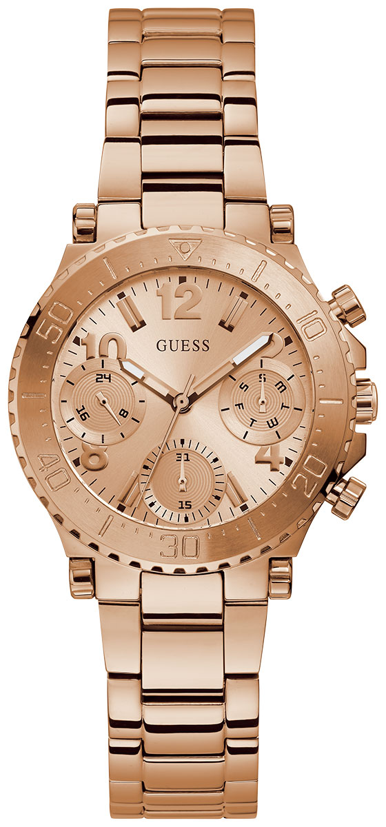 GUESS Cosmic GW0465L2 on tyylikäs naisten kello, jonka ruostumattomasta teräksestä valmistettu 36 mm leveä ja 10,3 mm paksu runko on ruusukullanvärinen. Rannekkeena tässä mallissa on ruusukullanvärinen ruostumaton teräsranneke. Kellon ominaisuuksiin kuuluu 24 tunnin näyttö, päivyri ja viikonpäivänäyttö. GUESS GW0465L2 -kellon ruusukullanväristä kellotaulua suojaa mineraalilasi. Kello kuuluu vesitiiviysluokkaan 50m / 5atm eli se on rajoitetusti vesitiivis (uintia ei suositella). GUESS-kellot toimitetaan valmistajan alkuperäisessä pakkauksessa ja niillä on kahden vuoden takuu.