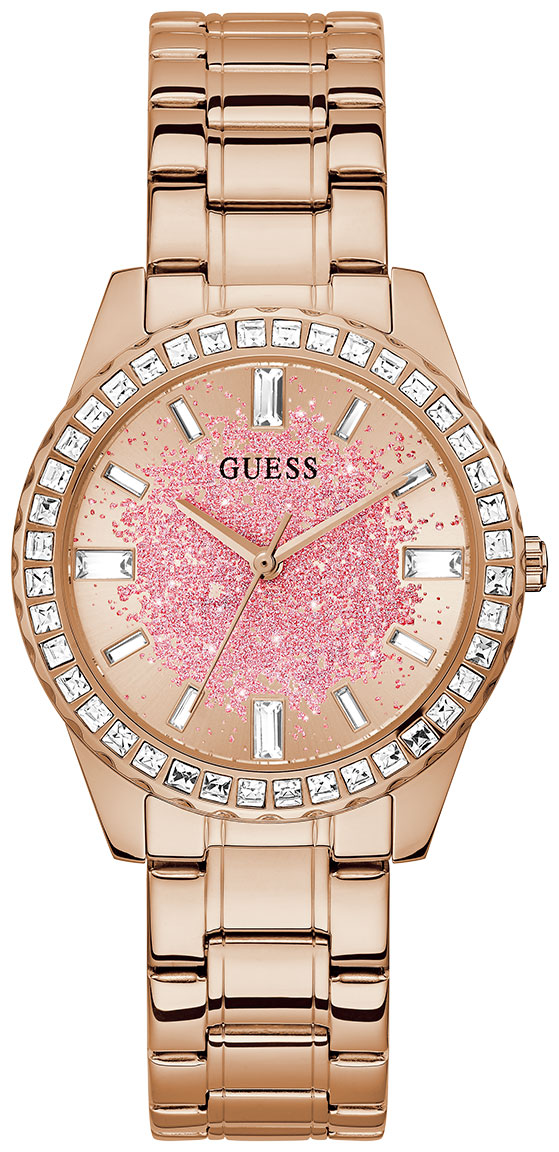 GUESS Glitter Burst GW0405L3 on tyylikäs naisten kello, jonka ruostumattomasta teräksestä valmistettu 38 mm leveä ja 10 mm paksu runko on ruusukullanvärinen. Rannekkeena tässä mallissa on ruusukullanvärinen ruostumaton teräsranneke, jonka leveys kiinnityskohdasta on 18 mm. GUESS GW0405L3 -kellon ruusukullanväristä kellotaulua suojaa mineraalilasi. Kello kuuluu vesitiiviysluokkaan 30m / 3atm eli se on roiskevesitiivis. GUESS-kellot toimitetaan valmistajan alkuperäisessä pakkauksessa ja niillä on kahden vuoden takuu.