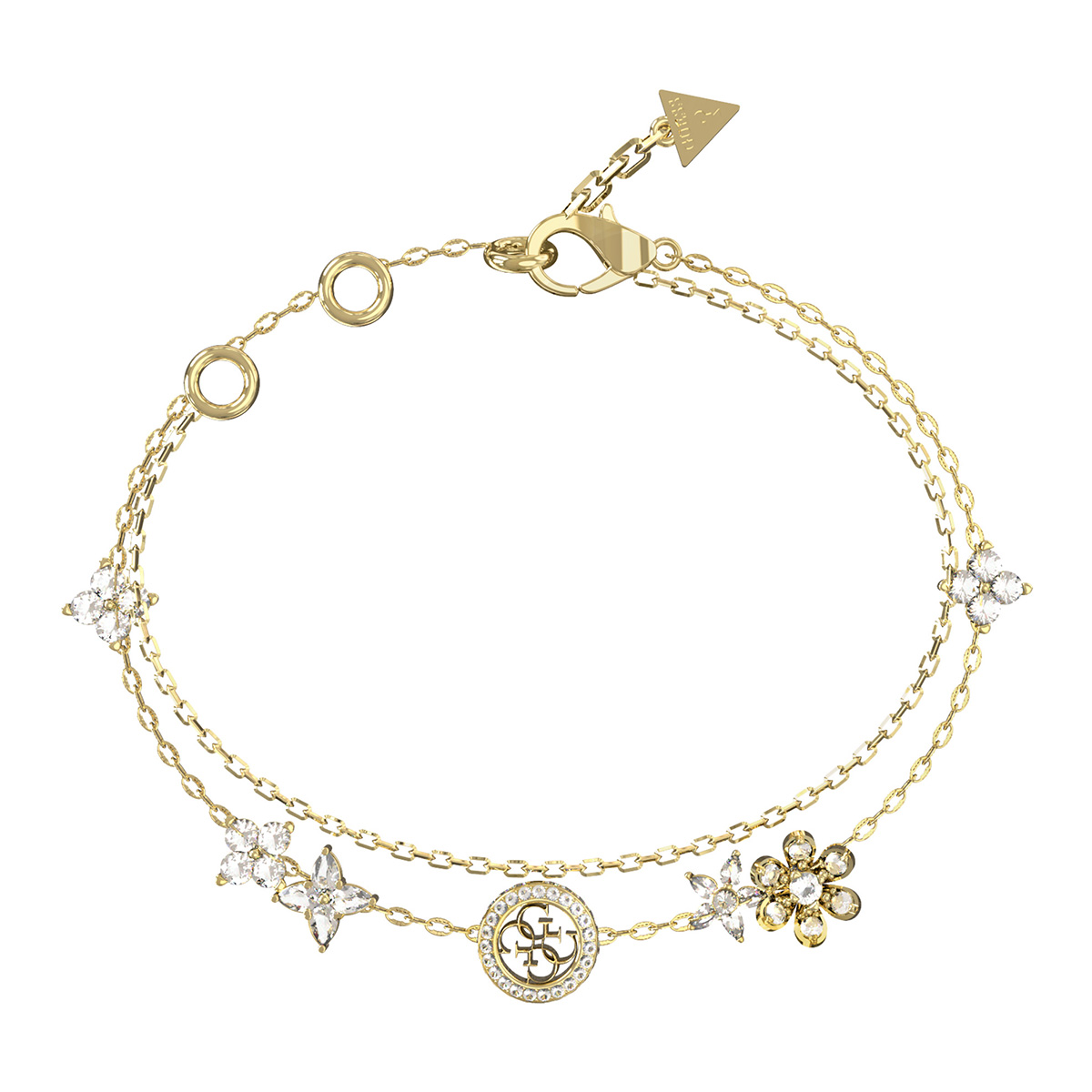 GUESS Secret Garden JUBB06029JWYGS rannekorussa on useita zirkonioilla koristettuja kukkakuvioita sekä pyöreä riipus keskellä, jotka tuovat ranteeseesi pirteää ja hienostunutta ilmettä. Kukkakuvioiset yksityiskohdat luovat vaikutelman salaisesta puutarhasta, josta tämä mallisto on saanut nimensä. Rannekoru on valmistettu kultapinnoitetusta ruostumattomasta teräksestä, jossa on lisäksi helposti avattava ja suljettava papukaijalukko. Secret Garden -rannekoru on suunniteltu sekä arkeen että juhlaan sopivaksi — se toimii kauniina katseenvangitsijana sellaisenaan tai yhdistettynä muiden Secret Garden-malliston koruihin, kuten kaulakoruihin tai korvakoruihin. Ketjun pituus 14,6 - 18,4 cm.