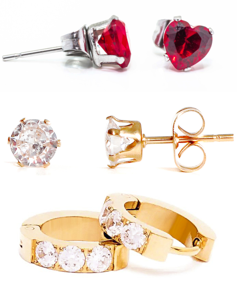 Hopeapuro korvakorusetti 2 K177 sisältää kolme paria kauniita korvakoruja, jotka sopivat useisiin erilaisiin tilanteisiin. Kullanväriset Selja-korvarenkaat ovat täydelliset arjessa, kun taas yksikiviset Tähtituike-solitaire-korvakorut sopivat täydellisesti juhlavaan tilaisuuteen. Suloisia Hani- sydänkorvakoruja käytät sekä arjessa että juhlassa. Korvakorut on valmistettu allergiavapaasta koruteräksestä. Koruja koristaa briljanttihiotut, synteettiset zirkoniat.