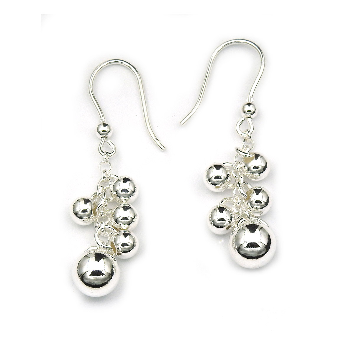 Nämä koukulliset pallokorvakorut ovat hauskat ja näyttävän kokoiset. Ne ovat kuitenkin kevyet, joten niitä on mukava käyttää. Korvakorujen koristeosa on korkeudeltaan 35 mm, isoin pallo on halkaisijaltaan 8 mm. Pallot heilahtelevat kivasti roikkuvissa korvakoruissa. Valmistettu aidosta hopeasta.