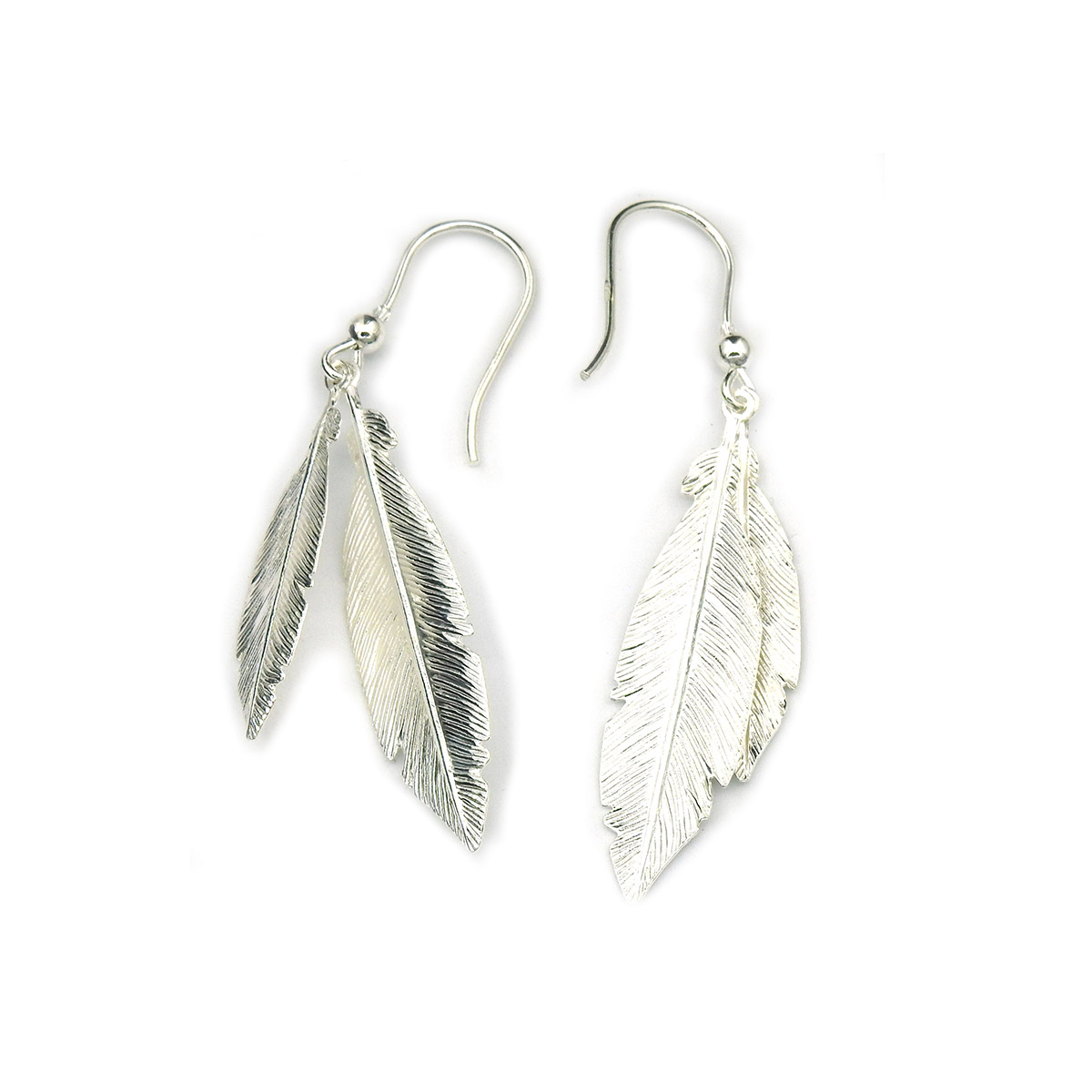 Koukulliset tuplasulkakorvakorut ovat erittäin näyttävät ja silti kevyet käyttää. Koukkukorvakorussa roikkuu kaksi erikokoista sulkaa, joista isompi on kooltaan 40 x 10 mm. Korvakorut ovat valmistettu aidosta hopeasta.