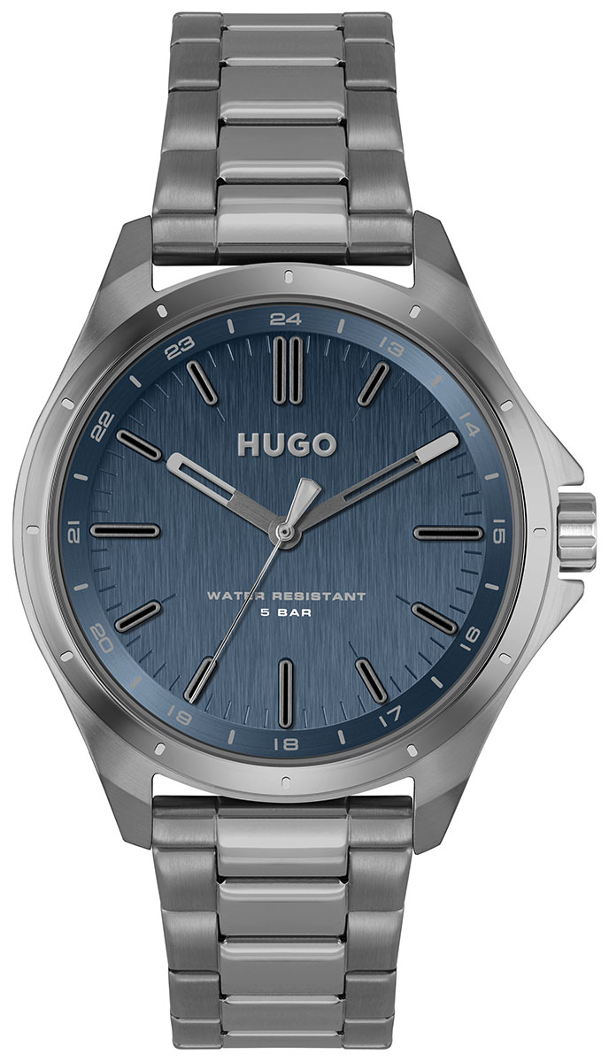 HUGO Complete 1530324 -miesten rannekello sopii hyvin arkeen ja puvunkelloksi. Kellossa on 42 mm leveä runko ja sininen kellotaulu HUGO-logolla. Harmaan teräsrannekkeen pituus on 195 mm ja leveys 20 mm. Kello kuuluu vesitiiviysluokkaan 50m / 5atm eli se on rajoitetusti vesitiivis (uintia ei suositella). HUGO-kelloilla on kahden vuoden takuu, ja ne toimitetaan valmistajan alkuperäisessä rasiassa.