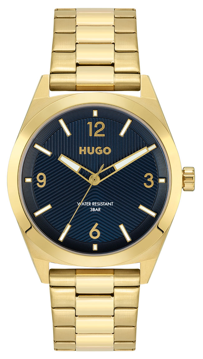 HUGO #MAKE 1530252 on tyylikäs miesten kello, jonka ruostumattomasta teräksestä valmistettu 42 mm leveä ja 9,5 mm paksu runko on kullanvärinen. Rannekkeena tässä mallissa on kullanvärinen ruostumaton teräsranneke, jonka leveys kiinnityskohdasta on 22 mm. HUGO 1530252 -kellon sinistä kellotaulua suojaa mineraalilasi. Kello kuuluu vesitiiviysluokkaan 30m / 3atm eli se on roiskevesitiivis. HUGO-kellot toimitetaan valmistajan alkuperäisessä pakkauksessa ja niillä on kahden vuoden takuu.