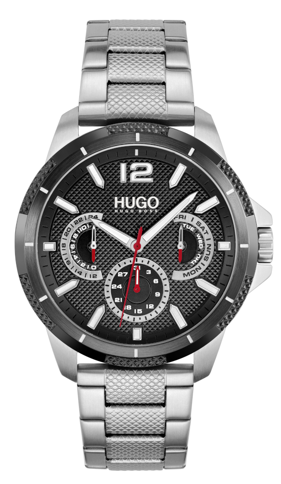 Hopeanvärisessä HUGO #SPORT 1530195-miesten rannekellossa on sporttinen ilme ja monipuoliset multifunction-toiminnot. Suuressa 46 mm leveässä rungossa on huomiota herättävä uritettu kellokehä, ja kolme virtaviivaista näyttöä kolmannen, kuudennen ja yhdeksännen indeksin kohdalla, joista on helppo seurata päivämäärää ja kellonaikaa. Ilmeen viimeistelee punaiset yksityiskohdat, ja kuviointi, joka jatkuu kellon teräsrannekkeessa. Kellon vesitiiveysluokka on 30 m / 3 atm, ja se on roiskevesitiivis. Kello on valmistettu 316L-kirurginteräksestä.