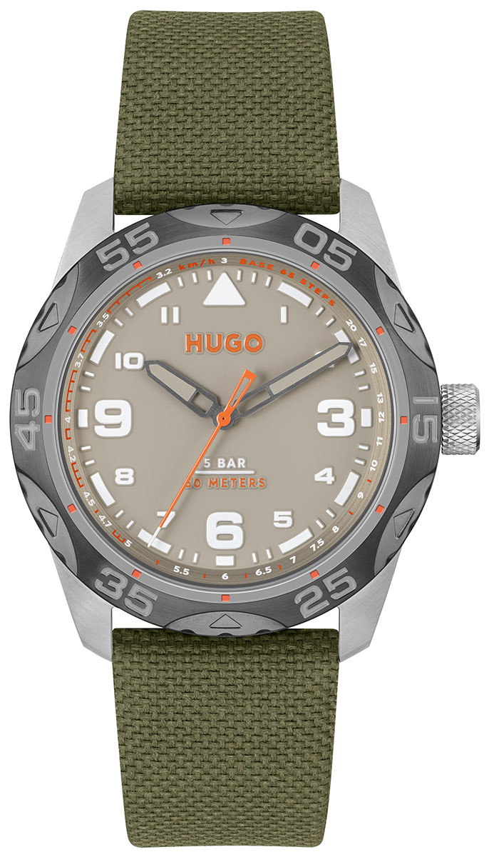 HUGO Trek 1530331 on tyylikäs miesten kello, jonka ruostumattomasta teräksestä valmistettu runko on 42 mm leveä ja 9,3 mm paksu. Rannekkeena tässä mallissa on vihreä kangasranneke, jonka leveys kiinnityskohdasta on 22 mm ja pituus 160 - 210 mm. Kellotaulua suojaa kestävä mineraalilasi. Kello kuuluu vesitiiviysluokkaan 50m / 5atm eli se on rajoitetusti vesitiivis (uintia ei suositella). HUGO-kellot toimitetaan valmistajan alkuperäisessä pakkauksessa ja niillä on kahden vuoden takuu.