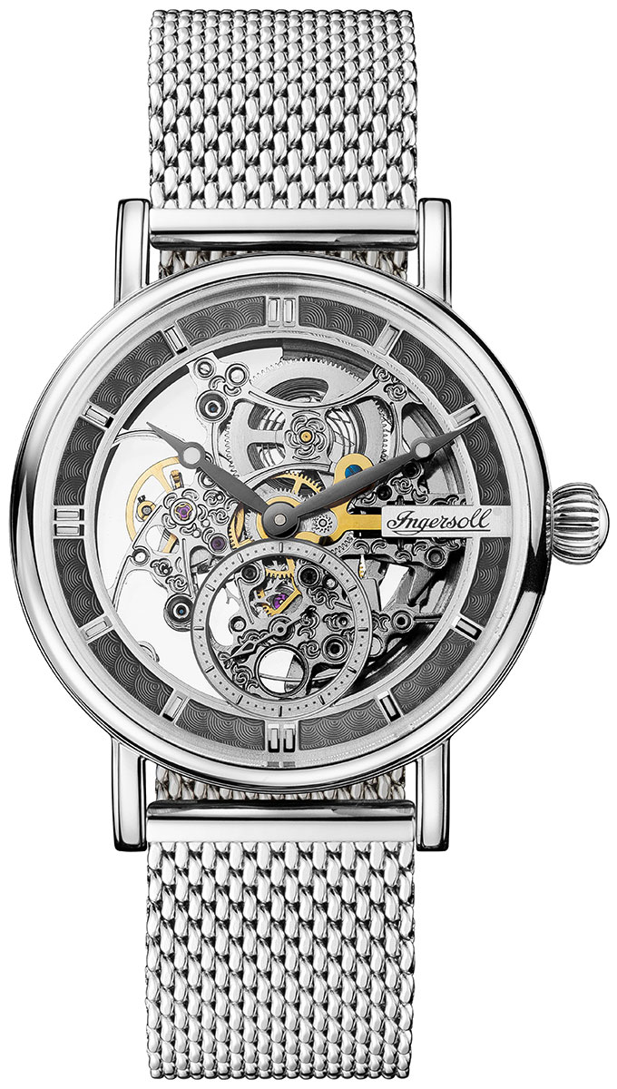 Ingersoll The Herald Automatic I00405B on tyylikäs miesten automaattikello, jonka 40 mm leveä ja 14 mm paksu hopeanvärinen runko on valmistettu ruostumattomasta teräksestä. Runkoon kiinnittyy hopeanvärinen ruostumaton teräsranneke, jonka leveys kiinnityskohdasta on 20 mm. Mineraalilasin alla suojassa on luurankokellotaulu. Ingersoll I00405B kuuluu vesitiiviysluokkaan 50m / 5atm eli se on rajoitetusti vesitiivis (uintia ei suositella). Ingersoll-kelloilla on 2 vuoden takuu. HUOM! Kellon mukana ei toimiteta alkuperäistä rasiaa (Huomioitu hinnassa).