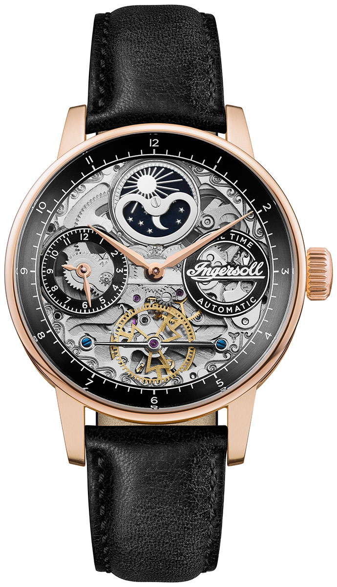 Ingersoll The Jazz Automatic I07705 on tyylikäs miesten automaattikello, jonka 42 mm leveä ja 16 mm paksu ruusukullanvärinen runko on valmistettu ruostumattomasta teräksestä. Runkoon kiinnittyy musta nahkaranneke, jonka leveys kiinnityskohdasta on 20 mm. Mineraalilasin alla suojassa on luurankokellotaulu, jossa kuunkiertonäyttö. Ingersoll I07705 kuuluu vesitiiviysluokkaan 50m / 5atm eli se on rajoitetusti vesitiivis (uintia ei suositella). Ingersoll-kelloilla on 2 vuoden takuu. HUOM! Kellon mukana ei toimiteta alkuperäistä rasiaa (Huomioitu hinnassa).