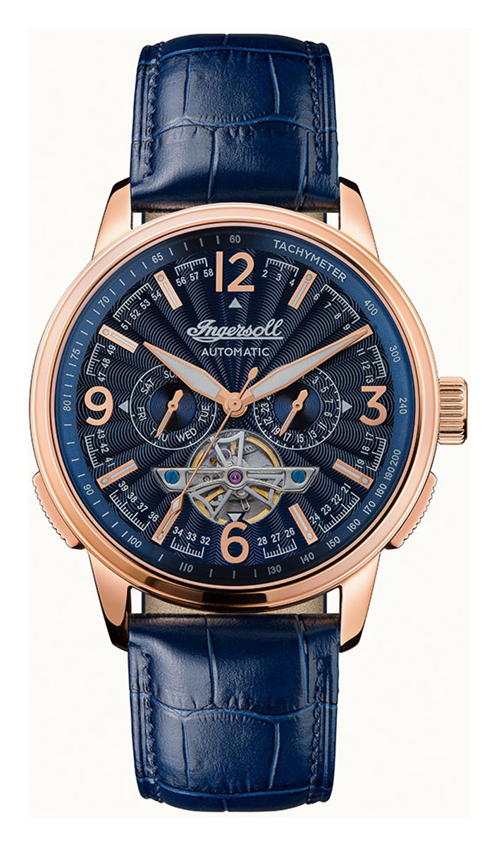 Ingersoll The Regent Automatic I00301B on tyylikäs miesten automaattikello, jonka 47 mm leveä ja 17 mm paksu ruusukullanvärinen runko on valmistettu ruostumattomasta teräksestä. Runkoon kiinnittyy sininen nahkaranneke, jonka leveys kiinnityskohdasta on 24 mm. Mineraalilasin alla suojassa on sininen kellotaulu, jossa päivyri ja viikonpäivänäyttö. Ingersoll I00301B kuuluu vesitiiviysluokkaan 50m / 5atm eli se on rajoitetusti vesitiivis (uintia ei suositella). Ingersoll-kelloilla on 2 vuoden takuu. HUOM! Kellon mukana ei toimiteta alkuperäistä rasiaa (Huomioitu hinnassa).