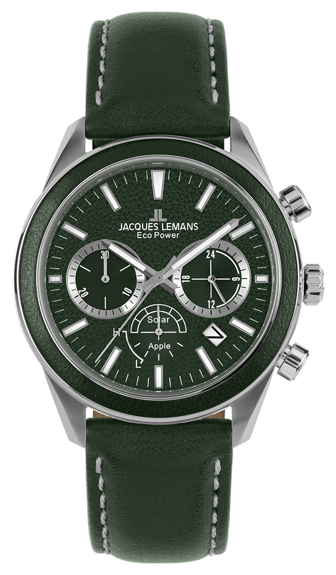 Jacques Lemans Eco Power 1-2115D on tyylikäs miesten kronografikello. Kellon 44 mm leveä runko on valmistettu hopeanvärisestä ruostumattomasta teräksestä. Mineraalilasin alla suojassa on vihreä kellotaulu, jossa päivyri ja ajanotto-ominaisuudet. Rannekkeena kellossa on vihreä AppleSkin-vegaaniranneke. Jacques Lemans 1-2115D kuuluu vesitiiviysluokkaan 100m / 10atm eli se on uintitiivis. Jacques Lemans -kelloilla on 2 vuoden takuu ja ne toimitetaan valmistajan alkuperäisessä rasiassa.
