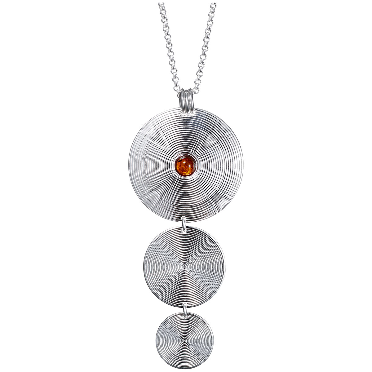 Näyttävässä Kalevala Kosmos 2268770ME45 hopeisessa kaulakorussa yhdistyy upeasti viileä hopea ja lämminhehkuinen Itämeren meripihka. Korun materiaalien sävyerot luovat dramaattisen ilmeen ja tekevät korusta todellisen katseenvangitsijan. Kosmos-koruissa yhdistyy rentous, minimalistinen tyylikkyys ja moderni muotoilu. Kaulakorussa on kolme erikokoista Kosmos-spiraalia papuketjussa. Ketjun pituutta voi säätää 42/45 cm mittaiseksi. Riipuksen korkeus on 94 mm ja se on valmistettu käsityönä Suomessa.