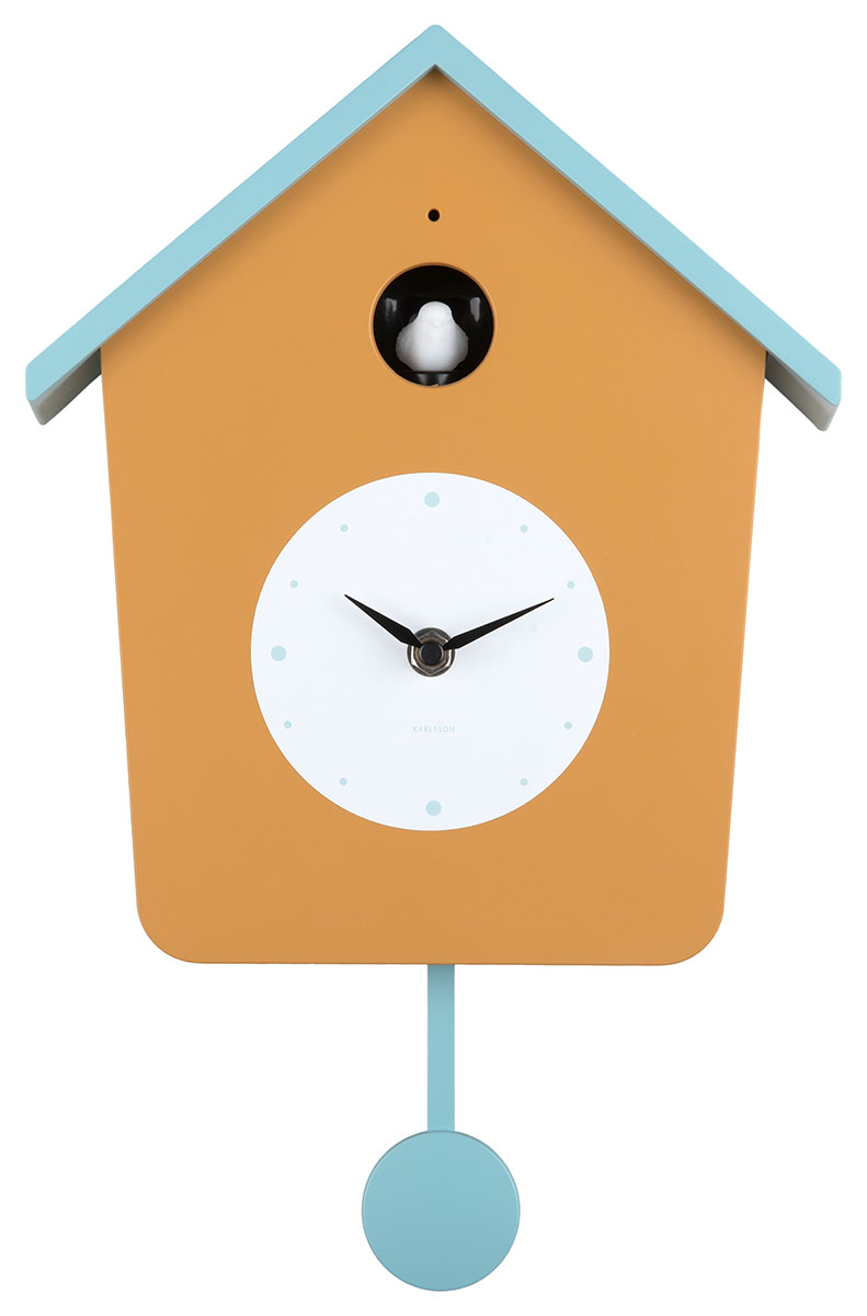 Karlsson Cuckoo KA6044YE on värikäs käkikello heilurilla, jonka valkoinen lintukoriste kukkuu tasatunnin välein. Seinäkello on valmistettu polystyreenista ja se on korkeudeltaan 26,4 cm sekä leveydeltään 10,5 cm. Kello toimii 4 kpl x AA-paristoja (paristot ei sisälly pakkaukseen).