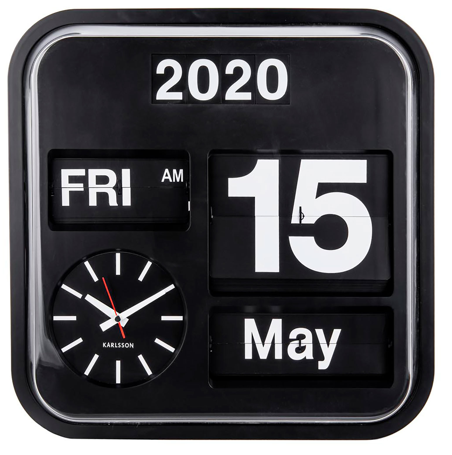 Karlsson KA4200 Big Flip Black -seinäkello on käytännöllinen ja tyylikäs lisävaruste elämään. Big Flip antaa sinulle täydellisen yleiskatsauksen ajasta, päivästä ja päivämäärästä; kaikki yhdellä silmäyksellä. Musta runko ja kellotaulu tekevät siitä modernin koriste-esineen seinälle. Kellon mitat: 43 cm x 43 cm x 6,5 cm. Kello toimii kahdella D-paristolla ja yhdellä AA-paristolla. (paristot eivät sisälly hintaan). Karlsson-kelloilla on kahden vuoden takuu.
