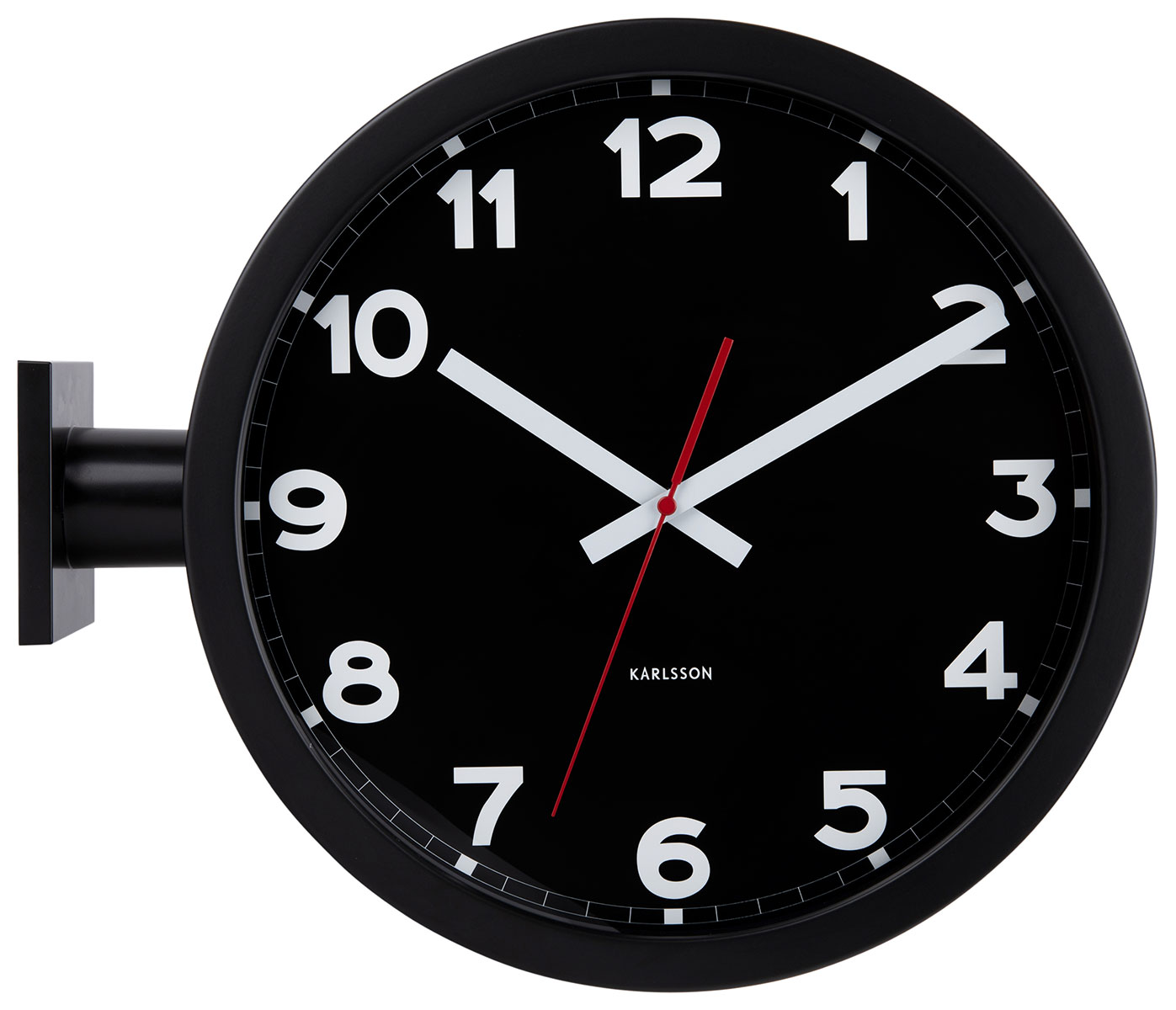 Karlsson New Classic Double Sided KA5966BK on kaksipuolinen alumiinista valmistettu seinäkello, jonka mustassa kellotaulussa on valkoiset selvät numeroindeksit ja sekuntiviisari tarkkaa ajanottoa varten. Halkaisija on 38 cm. Kello toimii kahdella AA-paristolla (paristot ei sisälly hintaan). Karlsson-kelloilla on kahden vuoden takuu.