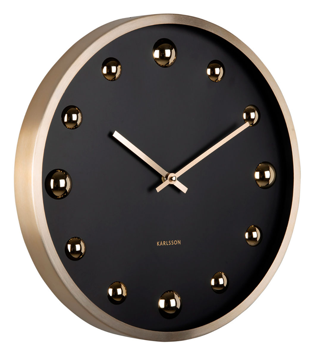 Karlsson Shiny Dots black with gold KA5971BK seinäkellossa on tyylikkäät alumiinista valmistetut kullanväriset palloindeksit ja minuutti- ja tuntiviisarit, jotka erottuvat erinomaisesti mustasta kellotaulusta. Kello on halkaisijaltaan 35,5 cm ja paksuudeltaan 4,2 cm. Seinäkello toimii yhdellä AA-paristolla (paristo ei sisälly pakkaukseen).